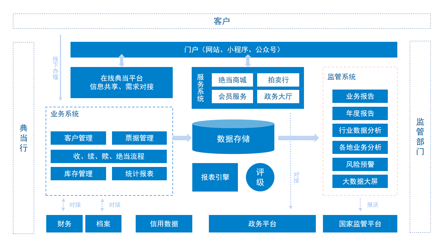平台汇聚客户、典当行、当品、业务流程数据,通过科技手段分析提 取有效信息,展示行业发展情况,辅助监管调控。