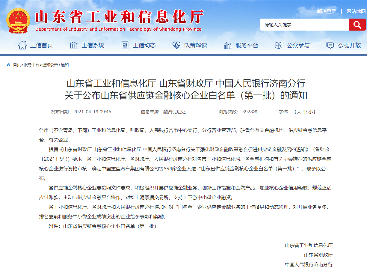 根据《山东省财政厅 山东省工业和信息化厅 中国人民银行济南分行关于强化财政金融政策融合促进供应链金融发展的通知》(鲁财金〔2021〕9号)要求,省工业和信息化厅、省财政厅、人民银行济南分行对各市工业和信息化局、省金融机构和有关协会推荐的供应链金融核心企业进行资格审核,确定中国重型汽车集团有限公司等594家企业入选“山东省供应链金融核心企业白名单(第一批)”,现予以公布。